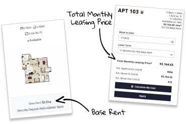 Planning your budget is essential, and we’re here to make it simpler. Our Total Monthly Leasing Price reflects all fixed, mandatory fees alongside your base rent, giving you a complete picture of your monthly costs. To customize your Total Monthly Leasing Price and plan with confidence, use our Calculate My Costs tool found within the Map view. We’ve also provided a list of all potential fees you may encounter as a resident, which can be found at the bottom of the page.